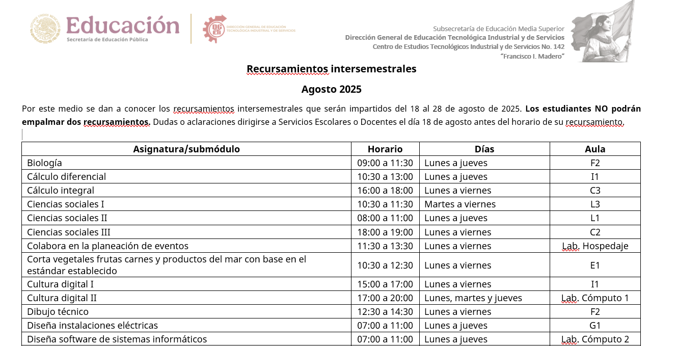 Por este medio se dan a conocer los recursamientos intersemestrales que serán impartidos del 18 al 28 de agosto de 2025. Los estudiantes NO podrán empalmar dos recursamientos. Dudas o aclaraciones dirigirse a Servicios Escolares o Docentes el día 18 de agosto antes del horario de su recursamiento.